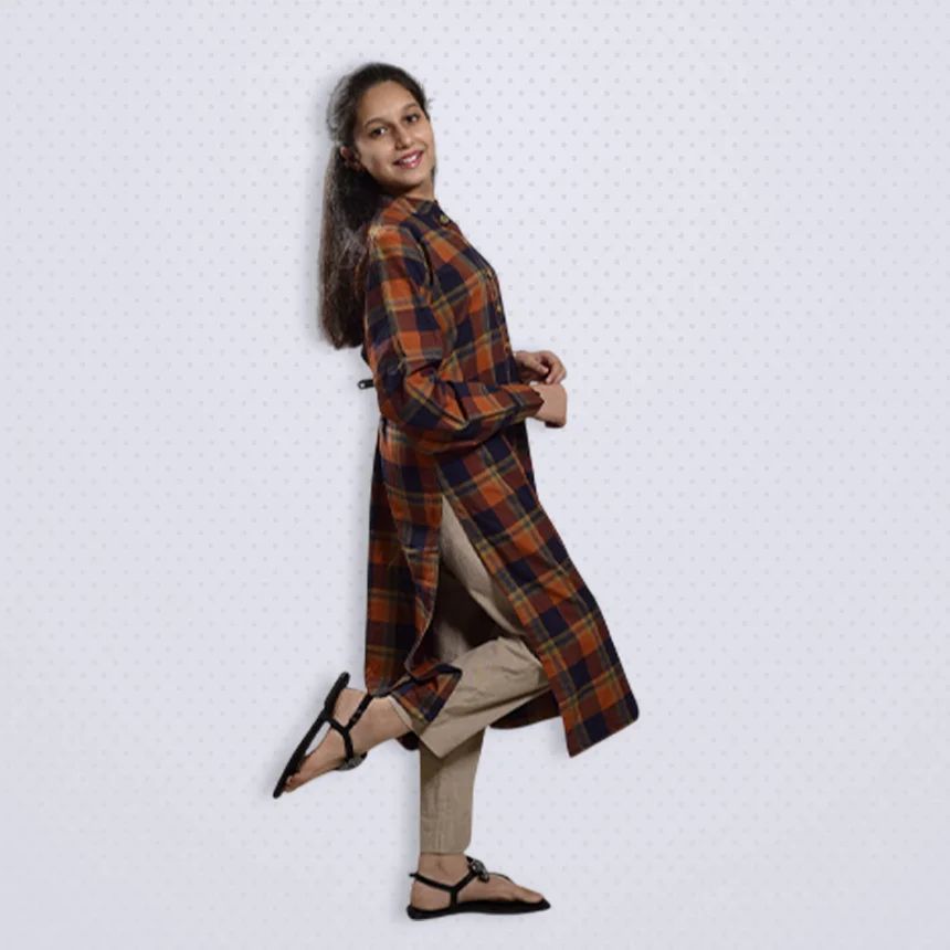 This everyday wear features a rich combination of deep navy blue and warm rust-orange checks, crafted from soft cotton fabric for all-day comfort. The smart collar neckline and wooden buttons add a touch of structure to this cozy and effortlessly stylish outfit.